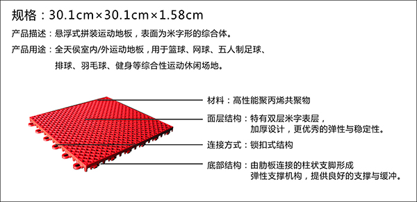 5、耐磨防滑耐用性:產(chǎn)品所用原料聚丙稀為高強(qiáng)度材料,使該產(chǎn)品具有耐壓、耐沖擊、耐高低溫、使用壽命長等優(yōu)點(diǎn)。耐 候性極高,不怕日曬高溫、雨淋潮濕、冰雪嚴(yán)寒、永不翹曲剝落變形。沒有氣候地域限制,雨后場地不積水。