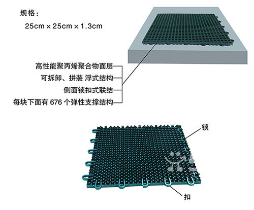 5、耐磨防滑耐用性:產(chǎn)品所用原料聚丙稀為高強(qiáng)度材料,使該產(chǎn)品具有耐壓、耐沖擊、耐高低溫、使用壽命長等優(yōu)點(diǎn)。耐 候性極高,不怕日曬高溫、雨淋潮濕、冰雪嚴(yán)寒、永不翹曲剝落變形。沒有氣候地域限制,雨后場地不積水。