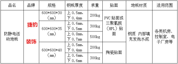 電話聯(lián)系:18929368984 劉經(jīng)理 全鋼防靜電地板(防靜電活動地板)根據(jù)貼面的不同,一般可分為pvc防靜電地板、三聚氰胺HPL防靜電地板、陶瓷面防靜電地板。具體規(guī)格如下: 配件比例:支架每平米*3.5只 橫梁每平米*5.3根 螺絲每平米*10.4只。地板承重及支架高度可訂制,具體需求請電話聯(lián)系。 聯(lián)系電話:18929368984 全鋼防靜電地板材質(zhì): 全鋼防靜電地板上層鋼板采用優(yōu)質(zhì)高強(qiáng)度抗拉鋼板沖壓成型,下層采用冷軋鋼板,兩層經(jīng)過沖壓形成鋼殼,鋼殼內(nèi)填充發(fā)泡水泥;表面采用高耐磨防靜電貼面。 產(chǎn)品特點: 1、全鋼結(jié)構(gòu),強(qiáng)度高、承載能力強(qiáng)、耐沖擊性能好; 2、表面靜電噴塑,柔光、耐磨、防水、防火、防塵、防腐蝕; 3、搭配橫梁及支架,能滿足有特殊高度的場所; 4、下部提供充足空間供室內(nèi)電纜、空調(diào)通風(fēng)使用; 5、粘貼的裝飾高壓層板,耐磨性及防靜電性能優(yōu)良、抗污染、便于清洗、裝飾性強(qiáng); 6、組裝靈活、維修方便、使用壽命長; 7、拆裝方便,可隨時輕易搬移至新處所,符合經(jīng)濟(jì)效益。 適用場所: 防靜電活動地板適用于大、中、小型的計算機(jī)機(jī)房,程控機(jī)房、監(jiān)控指揮中心、控制室、電化教室、電子閱覽室、各種電氣控制機(jī)房、等防塵、防靜電及需要架空的場合。 注意事項: 三聚氰胺面靜電地板 正常使用:1)室內(nèi)溫度在22℃±2℃。2)濕度為49%±2%。3)打掃的時候避免用過濕的拖把,以免貼面脫膠翹皮。 4)避免有尖刺、粗糙的重物在地板表面擦劃、拖拉、避免穿有釘子的鞋在地板上行走。 PVC面靜電地板 正常使用:最重要的一點是避免有尖銳的東西在地板表面擦劃、拖拉、避免穿有釘子的鞋在地板上行走。 產(chǎn)品型號 型號 LP-800 LP-1000 LP-1250 規(guī)格 (mm) 600×600×30/35 600×600×30/35 600×600×30/35 集中載荷 (N) 2950 4450 5560 均布載荷 (N/m 2 ) 12500 23000 33000 極限載荷 (N) 8850 13350 16680 防火性能 A 級 不燃 A 級 不燃 A 級 不燃 系統(tǒng)電阻 (Ω) 106 -109 Ω 106 -109Ω 106 -109Ω 安裝高度 100 -350mm 100-350mm 100-350mm